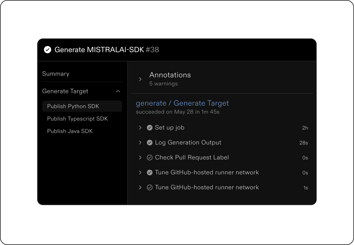 Integrate Terraform provider generation into your CI/CD workflows. Speakeasy fits into your existing tooling and acts like an extension of your team.
